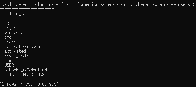 1. bWAPP DB의 'users' 테이블의 컬럼 이름 출력