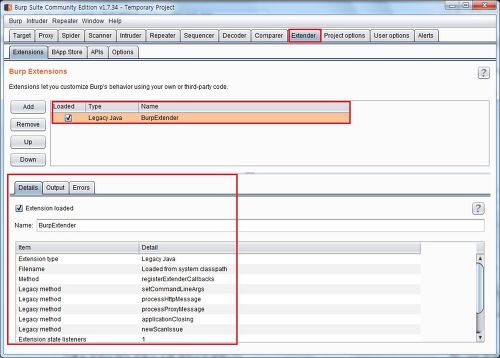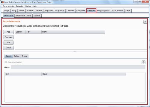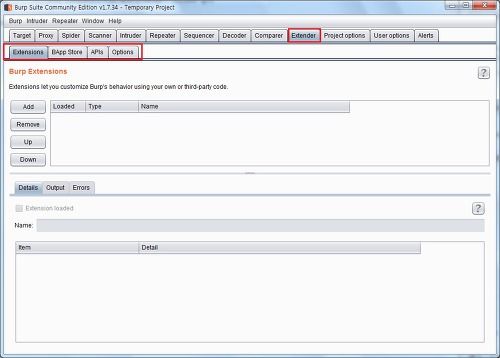 Burp Extensions 항목에서는 설치된 확장 기능의 목록을 확인할 수 있고, [ADD], [Remove], [Up], [Down] 버튼으로 항목을 추가하거나 삭제 등 관리를 할수 있습니다.
