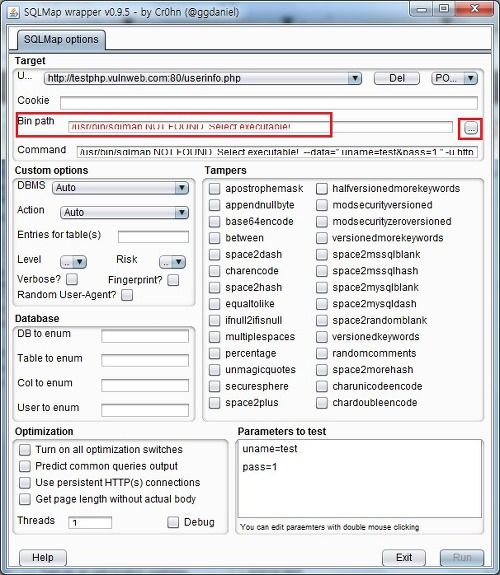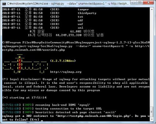 위에 빨간색으로 표시되는부분은 sqlmap.py 파일 경로가 안맞아서 나타나는 것이고 해당경로를 맞춰 주시면 됩니다. 파이썬 파일은 뭐가 문제인지 계속 에러가 떨어져서 그냥 명령프롬프트에서 테스트를 하였습니다. 테스트 홈페이지에서 테스트를 하시기 바랍니다.
