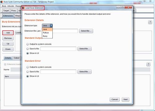 [Add] 버튼을 클릭하면 확장 기능을 추가할 수 있는 창이 뜨고, 기본적으로 확장 지원 언어는 Java, Python, Ruby 가있으며 언어에 맞게 환경을 구성해줘야 합니다. 여기서는 SQLMAP을 버프스위트에서 사용할수 있게 설치하도록 하겠습니다.