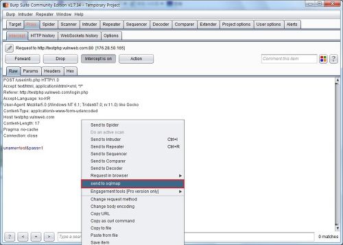 테스트 사이트에서 프록시를 잡고 send to sqlmap 을 눌러 보도록 하겠습니다.