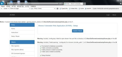 이제 여기서 Setup -> Setup / Reset -> Submit / Reset 버튼을 눌러 주시면 DB 설정 까지 완료 되신겁니다.