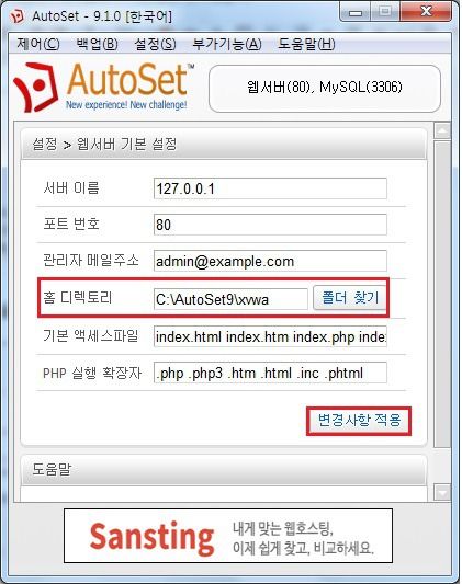 오토셋 매니저를 실행시키신 후 설정 -> 웹서버 기본 설정 -> 홈 디렉토리 변경 -> 변경사항 적용 -> 웹서버 재시작 (만약 웹서버와, MySQL 이 실행중이지 않다면 모두 실행을 시켜 주시기 바랍니다.)