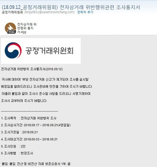 제목 : (18.09.12_공정거래위원회) 전자상거래 위반행위관련 조사통지서