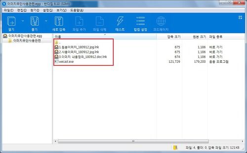 첨부파일안에는 실행파일 1개와, 바로가기 파일 3개가 존재하며 사용자의 클릭을 유도하여 악성코드를 감염시키는 형식으로 제작되어 있습니다.