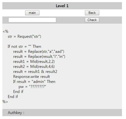 str = Request("str") - 입력하여 요청한 값을 str이라는 변수에 저장한다. If not str = "" Then - str 입력받은 텍스트가 아무것도 없지 않다면 코드를 실행 합니다. (If 앞에 not이 있으므로) result = Replace(str,"a","aad") - 'a'가 있을 경우 , 'add'로 바꿔진다. result = Replace(result, "i", "in") - 'i'가 있을 경우, 'in'으로 바꿔진다. result1 = Mid(result,2,2) - 2번째 부터 2개의 문자를 가져온다. result2 = Mid(result,4,6) - 4번째 부터 2개의 문자를 가져온다.