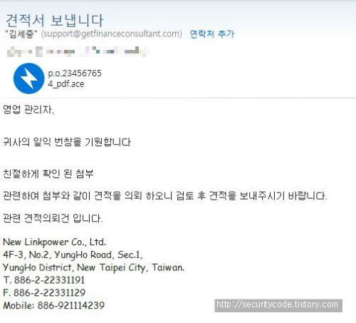 보안분석 : 견적서를 사칭한 악성메일 유포 주의 (2018.11.14)